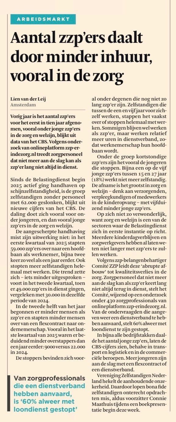 - Reformatorisch Dagblad: „Overheid behandelt zzp’er niet eerlijk” 11 augustus 2025